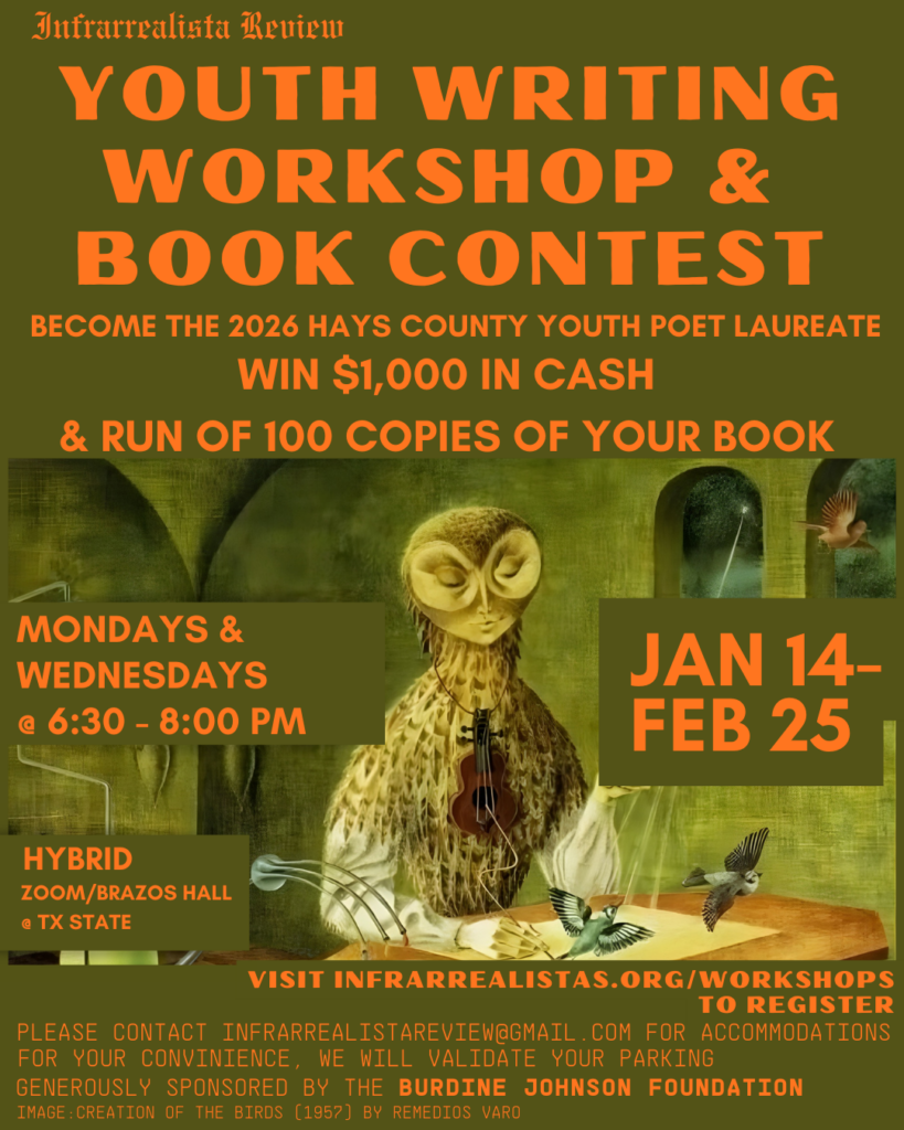 The winning manuscript will undergo an editing process by I.R. Editors, and released April 2026. The chapbook’s launch will be celebrated with a reading and book signing at The Price Center & Garden. The highest elected official in the county, Judge Ruben Becerra will recognize the Y.P.L. The Y.P.L. will be required to attend & speak at three City Council or Commissioners Court meetings while they hold this title. They would editorial assist one issue of Infrarrealista Review, meeting with the I.R. editors three times. They will also be invited to I.R.’s monthly poetry readings & encouraged to read at two of them.
