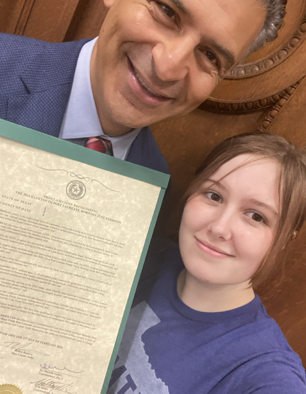 The proclamation stated that poetry is a powerful tool in a time when illness, war, climate change and mass shootings occur regularly because it allows people to articulate their pain. “The Hays Youth Poet Laureate program and award, launched by the local nonprofit Infrarrealista Review with vital support from The Burdine Johnson Foundation, was catapulted by a vision to promote literacy in underserved communities within Hays County,” the proclamation stated. “The HYPL program has successfully kindled the spirit of generating magic through language in our youth, with four formally trained poets serving as instructors in a free poetry workshop geared to the creation of a manuscript” The proclamation stated that the HYPL program shows youth that writing can be a viable career path and introduces students to minority role models such as the 2020 Texas Poet Laureate Emmy Perez.
